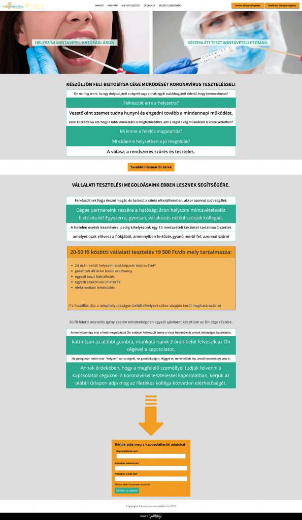 The creation of the koronavirusteszteles.hu website was a really honorable task for me, considering the emergency situation that developed in 2020. I was excited to be part of the fight against the Coronavirus in some way. We had to create the page with relatively short deadlines and on-the-fly modifications, but continuous communication made the process run smoothly. The final form of the website was recently created. This way, visitors can be informed about the various tests and also book an appointment using an online appointment booker. Of course, the appointment booker also monitors previous bookings, so everyone gets an individual appointment that they can choose for themselves. The website also helps to prevent you from booking at a different time, thus avoiding congestion or any problems you may have with it. The customer received an easy-to-use, functional page with a simple and clean design.